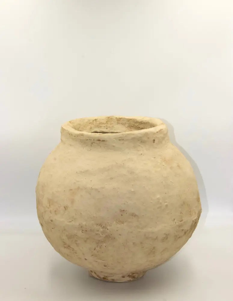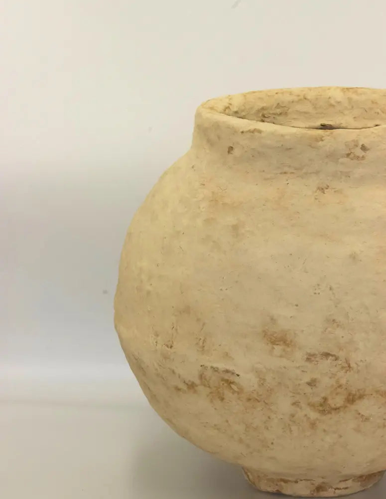 Jarrón decorativo de tamaño mediano hecho de papel maché. Cada pieza es única con un diseño distinto, destacando la combinación de su aspecto sólido y su ligereza.